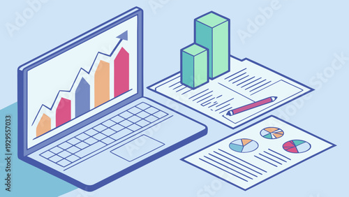 Web analytics koncept ploché vektorové ilustrace. Izometrický přenosný počítač s grafy, grafy na obrazovce. Analýza dat, statistiky webových stránek.