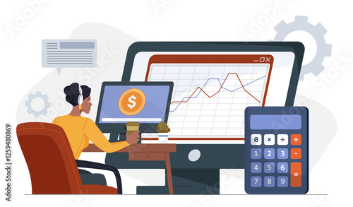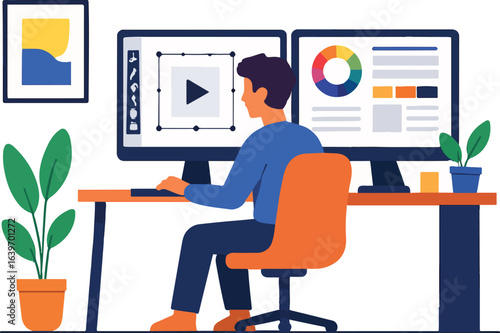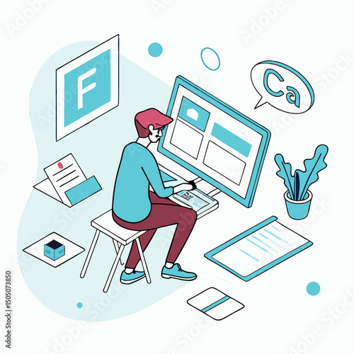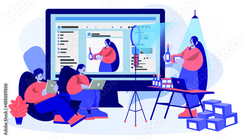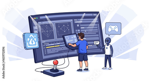 Vektorový koncept vývoje webových stránek s obrovským počítačovým monitorem a webovými designéry mikro mužských a ženských postav. Týmová práce, složení služeb webdesignu pro webový banner, webovou stránku atd.