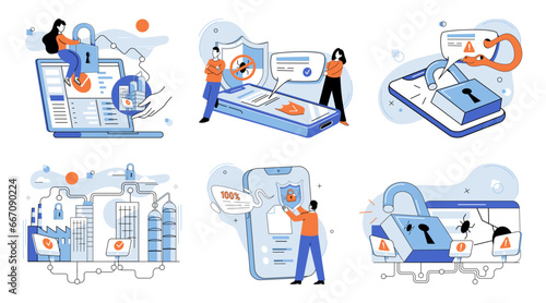 Sada scén pro vývoj webových aplikací, plochá vektorová izolovaná ilustrace. Web developer, designer kreslené postavičky programování, kódování.