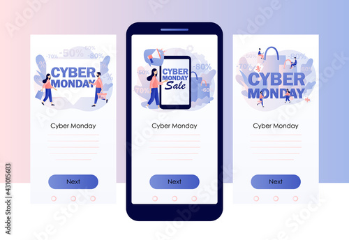 Webové stránky onboarding obrazovky. Digitální marketing, recenze zákazníků, sdílení fotografií. Menu vector banner šablona pro webové stránky a vývoj mobilních aplikací. Moderní design ploché ilustrace