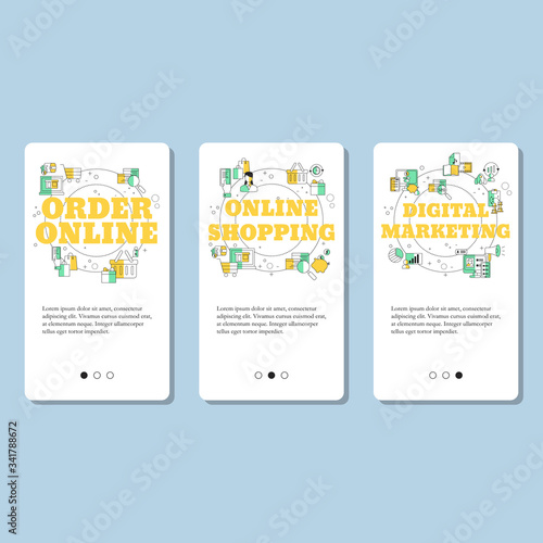 Webové stránky onboarding obrazovky. Internetové a počítačové služby, zálohování dat, videohovor a přístup na webové stránky. Menu vector banner šablona pro webové stránky a vývoj mobilních aplikací. Moderní design ploché ilustrace