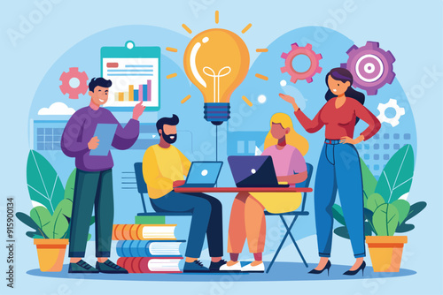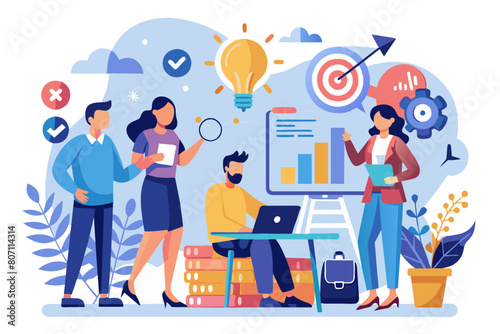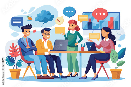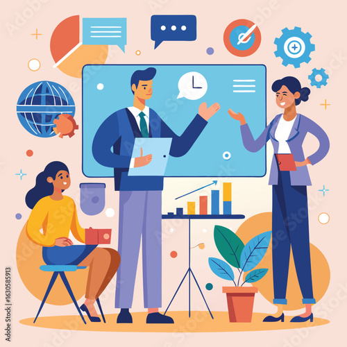 Studenti se učí online s lektorem v digitální učebně, vektorová plochá ilustrace. Webový seminář, obchodní webinář, online video školení, virtuální tutoriál, vzdálená výuka, technologie videokonference
