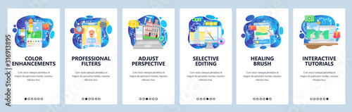 Onboarding pro webové stránky a mobilní aplikace. Menu banner vektorová šablona pro vývoj webových stránek a aplikací. Vedení, firemní školení, týmová práce, brainstorming, Kariérní schodiště, obrazovky zpráv.