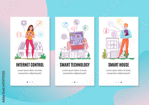 Onboarding pro web, mobilní aplikace. Menu banner vektorová šablona pro vývoj webových stránek a aplikací. Vlog, Info, Online hry a cvičení, lekce focení, psaní obrazovek. Plochý design.