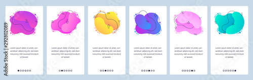 Webové stránky a mobilní aplikace onboarding obrazovky. Menu banner vektorová šablona pro vývoj webových stránek a aplikací s trendy modrou, fialovou a fialovou gradientem abstraktní dynamické tvary tekutin.