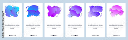 Webové stránky a mobilní aplikace onboarding obrazovky. Menu banner vektorová šablona pro vývoj webových stránek a aplikací s trendy žlutými, červenými, fialovými a fialovými gradienty abstraktní dynamické tvary tekutin.