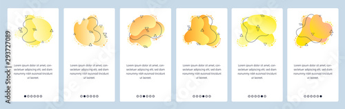 Webové stránky a mobilní aplikace onboarding obrazovky. Menu banner vektorová šablona pro vývoj webových stránek a aplikací s trendy růžovou, modrou, žlutou a fialovou gradientem abstraktní dynamické tvary tekutin.