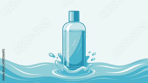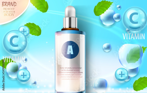 Bílá prázdná kosmetická láhev maketa, papír řezané řemeslné styl zelené lístky máty, postříkání, vektorové ilustrace. Šablona reklam na šampon Mint. Produkt pro péči o krásu a vlasy.