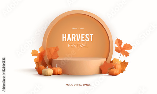 Bílý displej pódium maketa, papír řezané podzimní sezóny červené a žluté listy, bobule, věnec, vektorové ilustrace. Podzimní květinové pozadí pro reklamu na produkty.