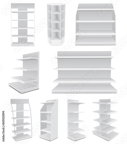 Bílá prázdná vitrína displej s policemi maketa set, vektorové izolované ilustrace. Realistický maloobchodní stojan, stojan, skleněné pouzdro, regály obchodů.