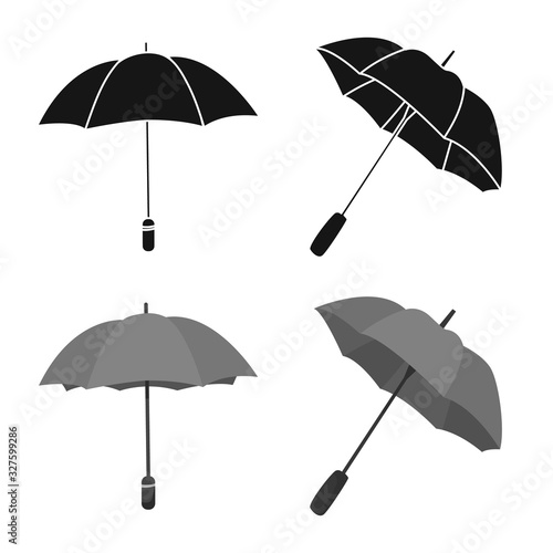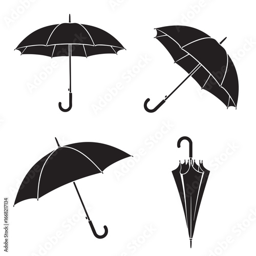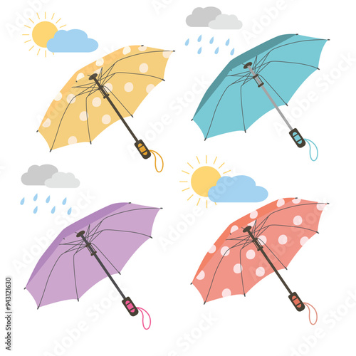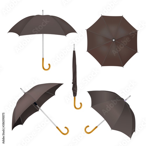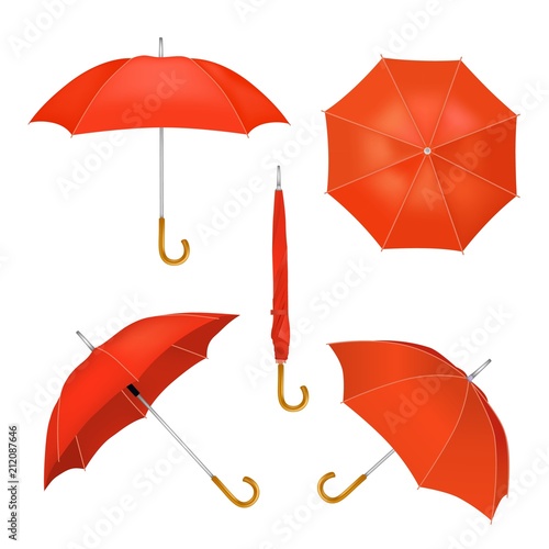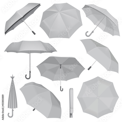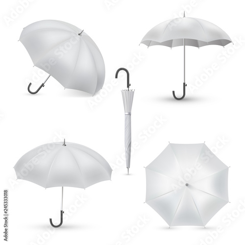 Bílý deštník maketa set, vektorové ilustrace izolovaných na bílém pozadí. Realistické vodotěsné složené a otevřené slunečníky v různých polohách.