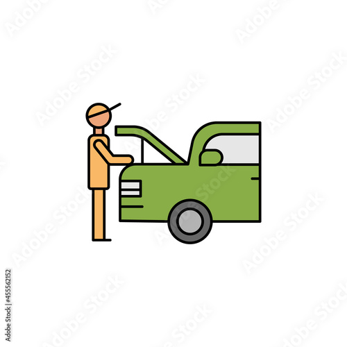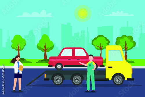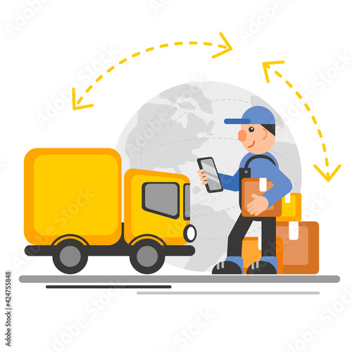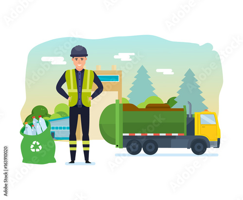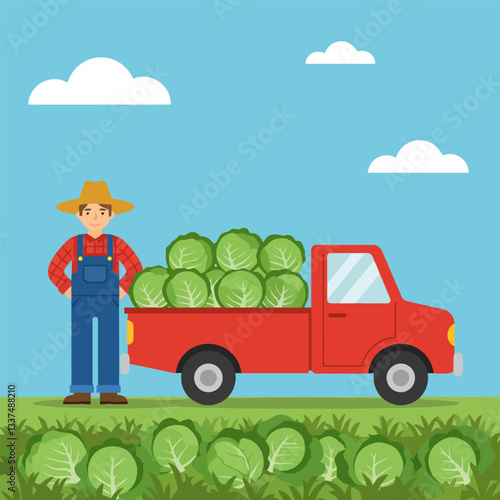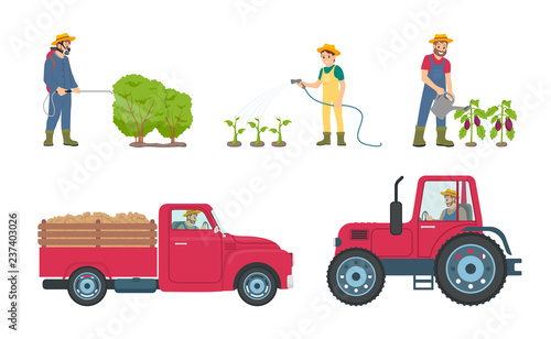 Sklizeň vinných hroznů, první krok ve vinařském procesu, plochá vektorová ilustrace. Vinice, farmář nebo zahradník s košíkem, traktor přepravující hrozny do vinařství.