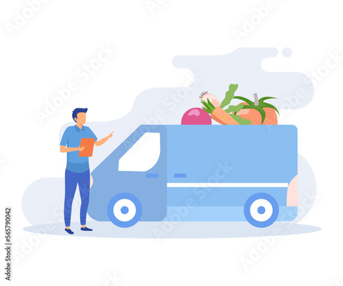 Sklizeň vinných hroznů, první krok ve vinařském procesu, plochá vektorová ilustrace. Vinice, farmář nebo zahradník s košíkem, traktor přepravující hrozny do vinařství.
