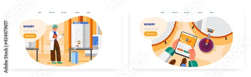Design vstupní stránky vinařství, sada šablon webových stránek, ilustrace plochého vektoru. Výroba hroznového vína, fermentační zařízení. Vinařská továrna. Proces výroby alkoholických nápojů.