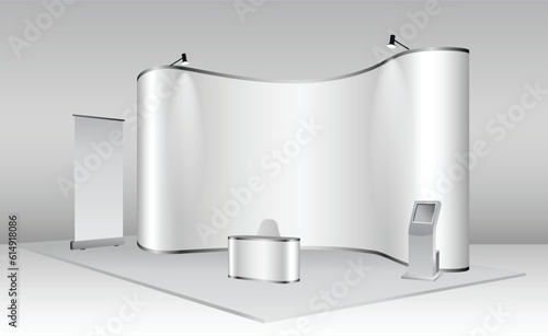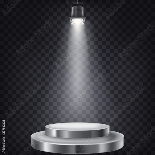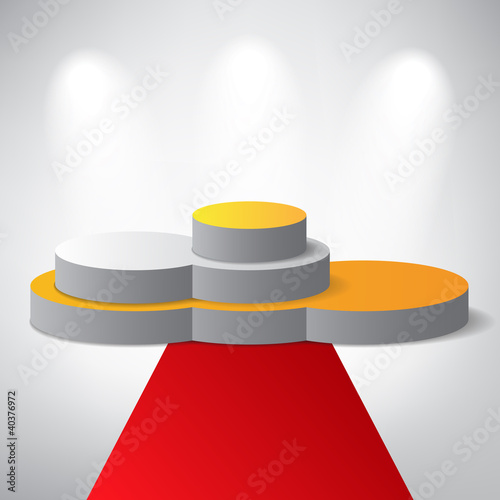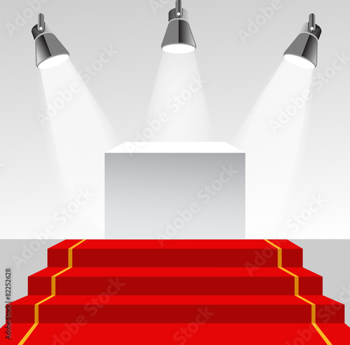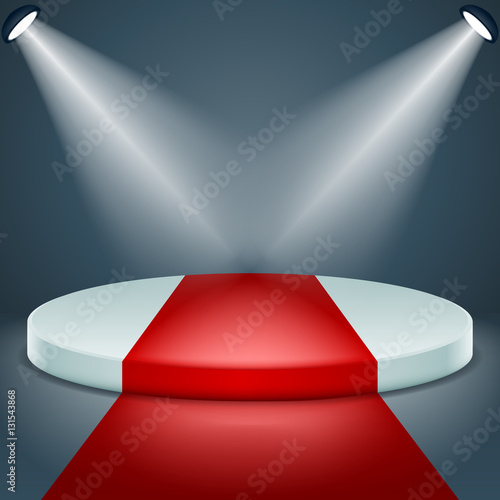 Vítěz pódium, vektorové realistické ilustrace. Bílý vítězný podstavec s červeným kobercem osvětlenými podlahovými reflektory. Fáze pro slavnostní předávání cen.