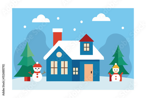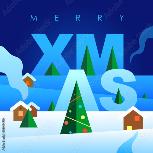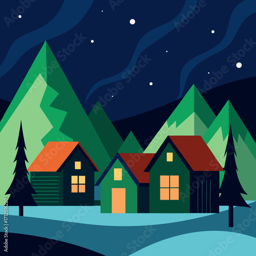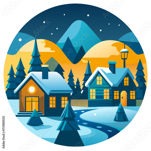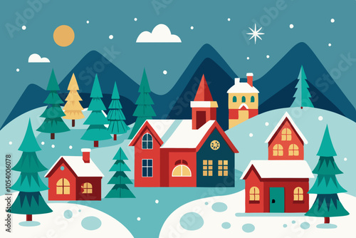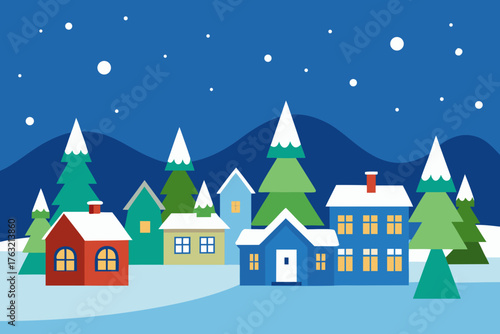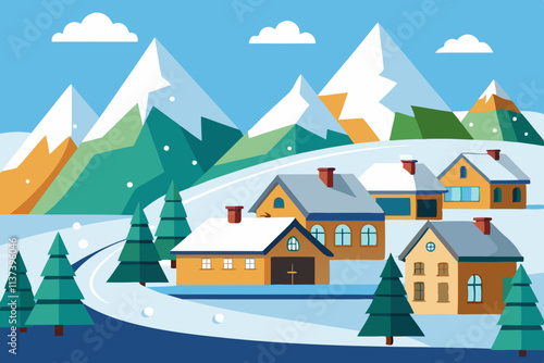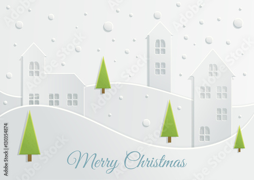 Zimní pozadí s zasněžené vesnice vektorové ilustrace v papíru cut craft art origami stylu. Vánoční Krajina pohlednice s údolím wonderland a útulné domy pod sněhem design šablony