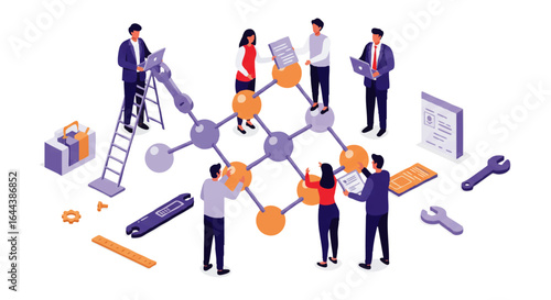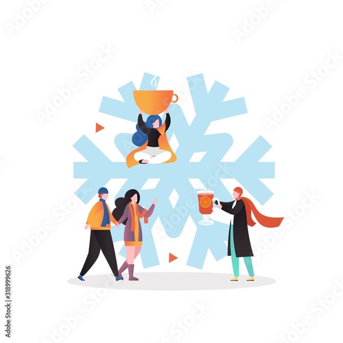 Obrovská sněhová vločka, šťastné mikro mužské a ženské postavy pití horkého čaje, oteplování svařeného vína, vektorové ilustrace. Zimní sezóna fun koncept pro web banner, webové stránky atd.