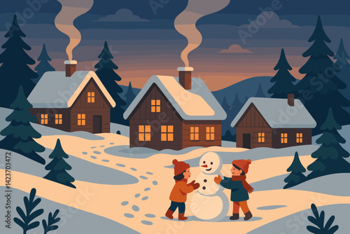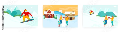 Návrh vstupní stránky zimního času, sada šablon bannerů webových stránek, plochá vektorová ilustrace. Rodinná dovolená. Lidé snowboarding, dělat sněhuláka. Zimní sport, rekreace a aktivní odpočinek.