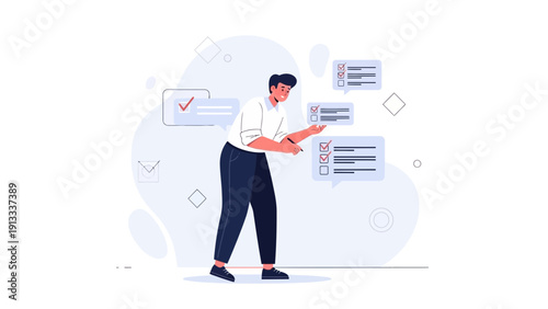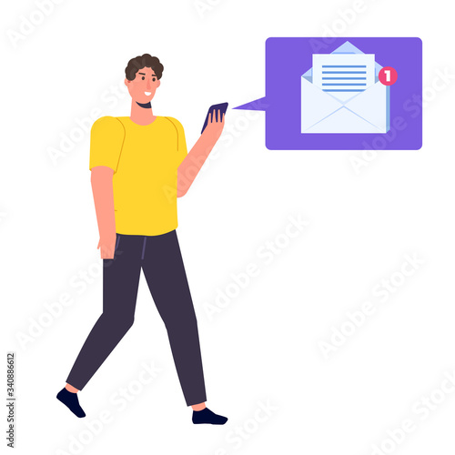 Obchodní muž chůzi s kufrem a smartphone s dolarem znamení zprávy bublina, vektor plochý izolovaný ilustrace. Koncept bezdrátové sítě komunikační technologie pro webový banner, webová stránka.