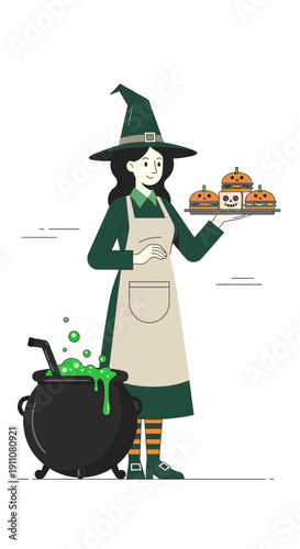 Čarodějnice vaření jed halloween kreslený vektor. Kotel s kouzelným lektvarem a roztomilá krásná dívka čaroděj kouzelník v klobouku a kostýmu vyprávění kouzlo přední vařící hrnec izolovaných na bílém pozadí