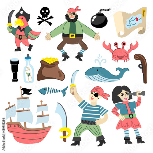 Kouzelník, kouzelník set, ploché vektorové ilustrace. Starý muž vousů v modrém kouzelnickém rouchu, klobouk, s kouzelnou hůlkou, kniha kouzel. Čaroděj, čaroděj, čarodějnické nástroje kotel, lektvar, boty. Mystery fantasy čarodějnictví