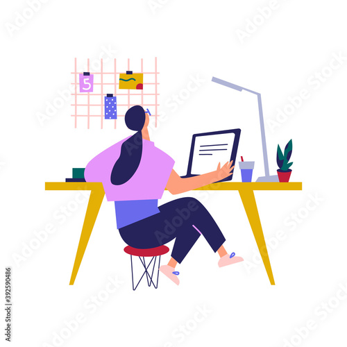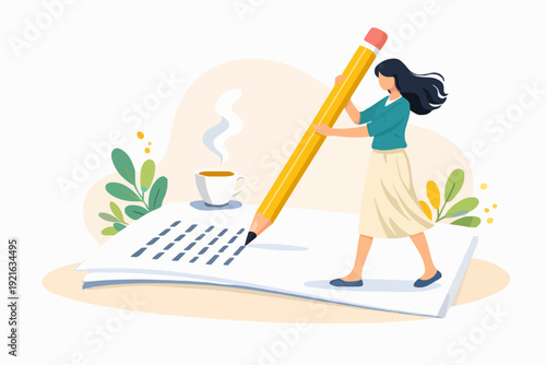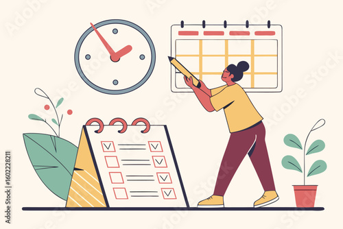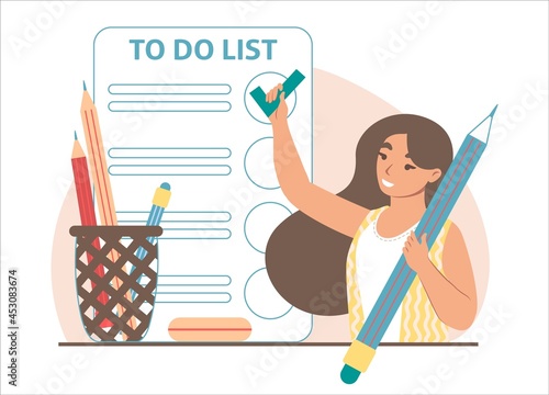 Šťastná žena přidání zaškrtnutí v seznamu úkolů s úkoly na obrazovce smartphonu, ploché vektorové ilustrace. Správa úloh, plánování, plánování. Kontrolní seznam mobilní aplikace.