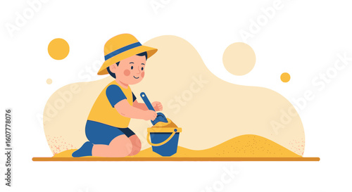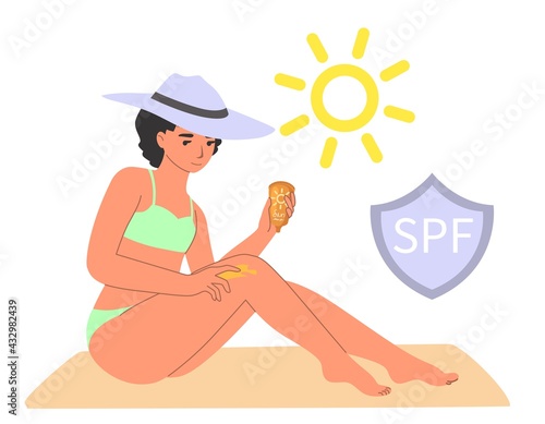Mladá žena na sobě plavky ad sluneční klobouk použití opalovací krém, ploché vektorové ilustrace. Opalovací krém, opalovací krém. Rutina péče o pleť na letní pláži.