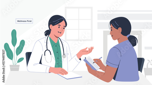 Žena u lékaře jmenování vektorové ikony izolovaných na bílém pozadí
