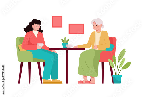 Péče o staré seniory. Žena přinést čaj staré osobě vektorové ilustrace. Osobní pomoc při odchodu do důchodu. Pečovatelský dům, dobrovolnická a charitativní služba