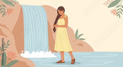 Žena vybrat vánoční strom v lese. Zimní sezóna vektor koncept ilustrace. Dívka pije horké víno a sedí na houpačce v parku.Šablona návrhu webových stránek.