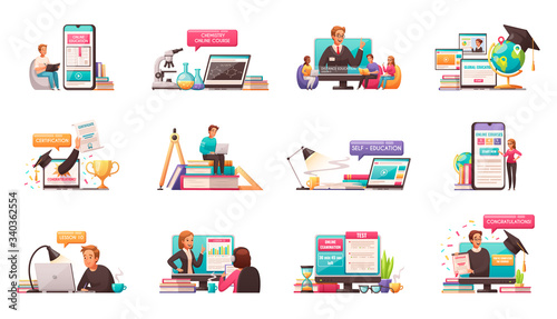 Žena každodenní život set, ploché vektorové ilustrace. Mladá dívka se probouzí, snídá, dělá make-up, jezdí na kole v parku, nakupuje, dělá domácí jógu. Denní ranní rutina, každodenní činnosti.