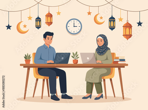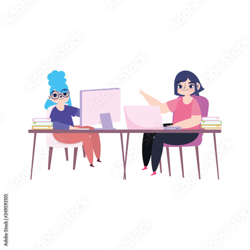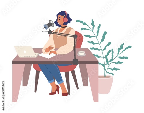 Žena ve sluchátkách mluví do mikrofonu před přenosným počítačem, ploché vektorové ilustrace. Dj vytváří podcast, hostování živé rozhlasové show ve studiu. Podcasting, online rádio.