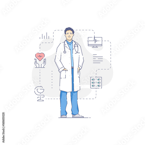 Žena lékař dává předpis ukázal pozornost znamení vektorové ikony izolovaných na bílém pozadí