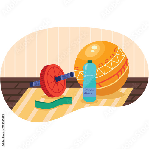 Žena dělá jógu doma. Cvičební nástroje. Fitness a zdravý životní styl koncept ilustrace. Vektor web design šablony. Žena představuje v pozici vrikshasana jógy.