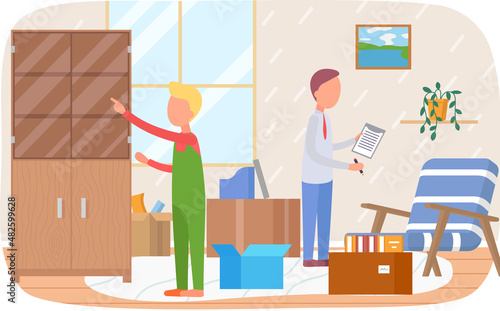 Šéfkuchař restaurace ženská postava dává tašku s jídlem s sebou na doručovatele, plochá vektorová ilustrace. Kavárna online objednávka jídla a doručovací služba.