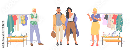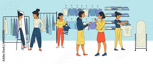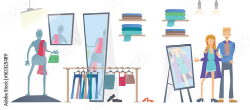 Žena v šatně s věšákem na oblečení, zrcadlo, ploché vektorové ilustrace. Ženská postava drží černé šaty. Dívka nakupuje oblečení.