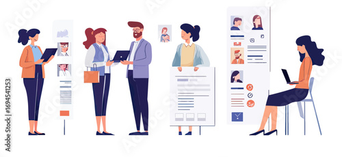 Žena v šatně s věšákem na oblečení, zrcadlo, ploché vektorové ilustrace. Ženská postava drží černé šaty. Dívka nakupuje oblečení.