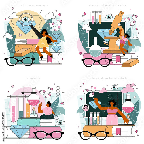 Žena ve VR brýlích pracuje s obrazovkami virtuální reality. Rozmanitost a prolomit vektorovou ilustraci konceptu zkreslení vědy. Ženy v technice. Inovativní technologie ve vědě. Žena developer.