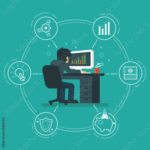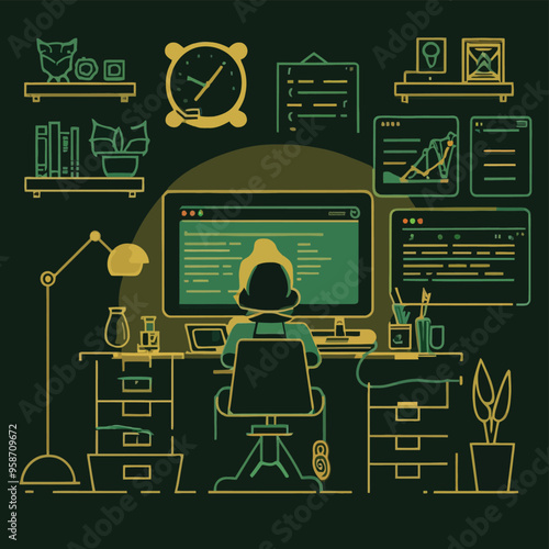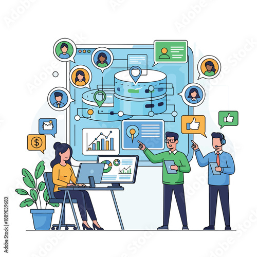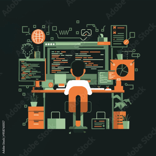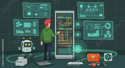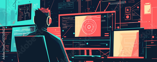 Žena na vozíku pracuje s obrazovkami virtuální reality. Inženýrka a analytička dat. Rozmanitost a prolomit vektorovou ilustraci konceptu zkreslení vědy. Ženy v technice. Inovativní technologie.