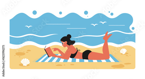 Žena, která leží na pláži a čte knihu. Letní dovolená koncept vektorové ilustrace. Dovolená na pláži, letní doplňky, dívka v bikinách.