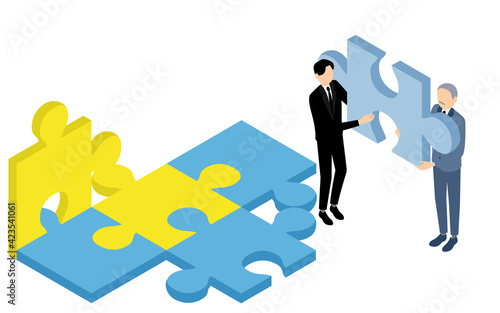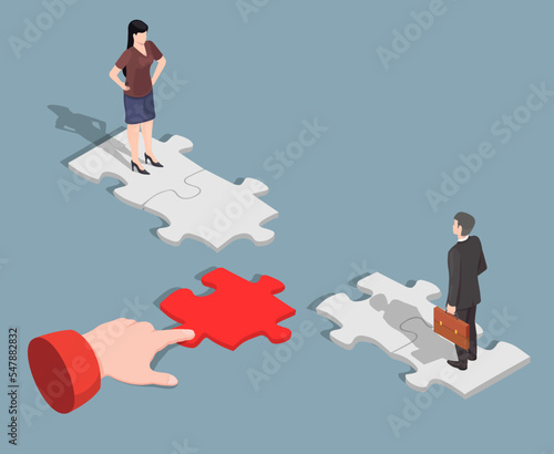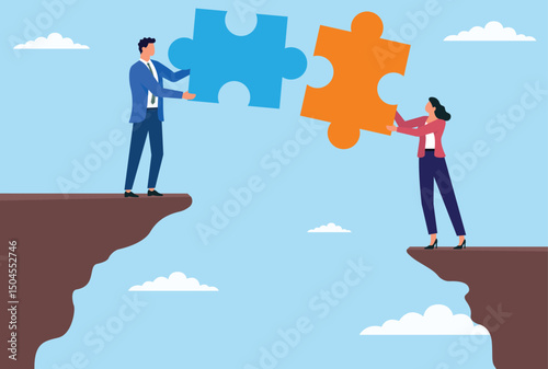 Žena, muž pár a skládačky vektor. Problém podnikatelů v partnerství a lidská ruka spojují most mezi ilustrací partnera. Koncept psychologie vztahů