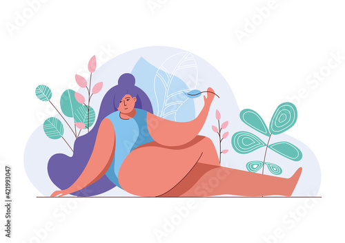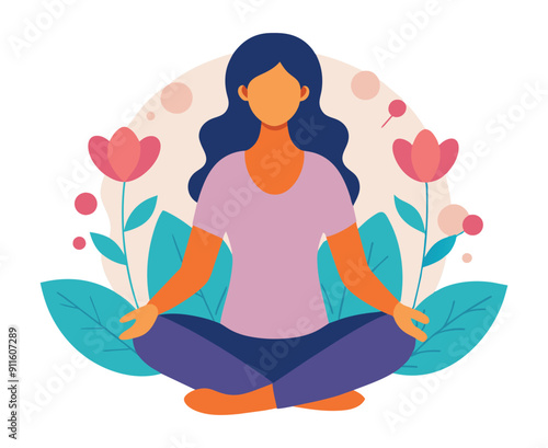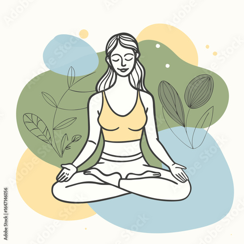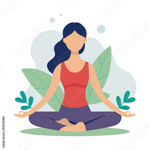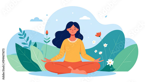 Mladá žena medituje o přírodě vektorové ilustrace. Cartoon dívka dělá stres úlevu cvičení, uklidňující mysl, dýchání pro harmonii. Koncept jógy, meditace, relaxace, rekreace, zdravého životního stylu