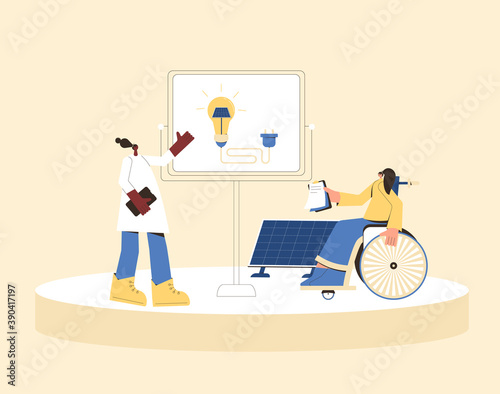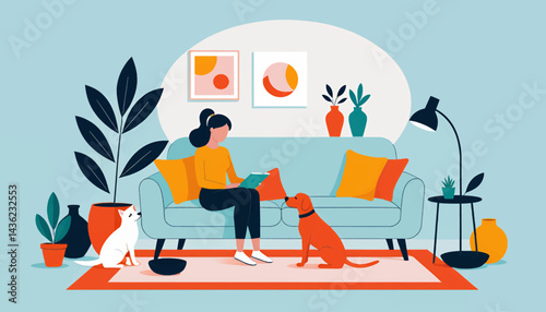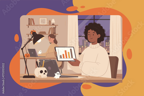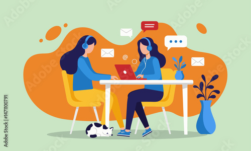 Žena meditující sedící v jógové pozici s přenosným počítačem v jedné ruce a pasem v druhé, plochá vektorová ilustrace. Myšlenkové bubliny. Myšlenky na kancelářskou práci a letní dovolenou na pláži.