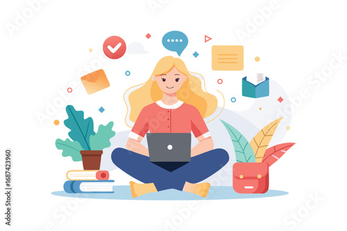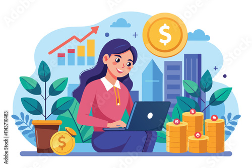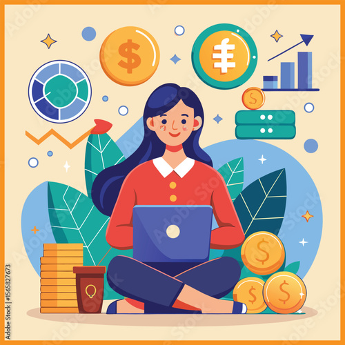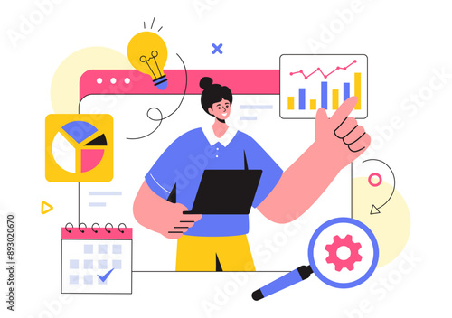 Žena NFT umělec portrét ploché vektorové ilustrace. Dívka, která má nápad vytvářet krypto umělecká aktiva pro aukční prodej. Blockchain, bitcoinová kryptoměna a koncept digitálního trhu