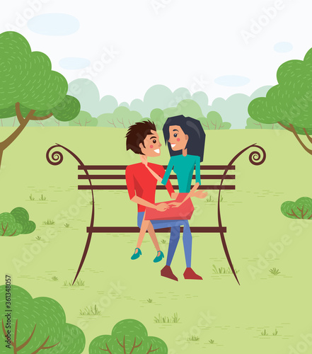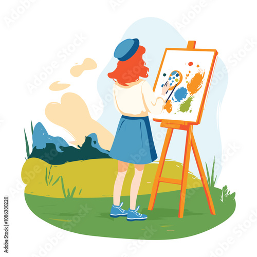 Krásná umělkyně mladá žena maluje zelené stromy na plátně v parku. Vektorové ilustrace v plochém stylu. Hobby a malba Art concept designový prvek.