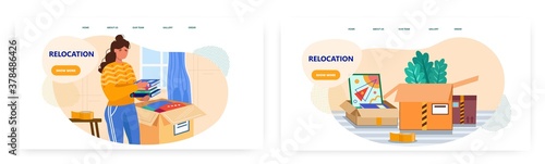 Žena se připravuje na pohyb a balení knih do kartonové krabice doma. Dům přemístění koncepce ilustrace. Vektor web design šablony. Krabice s knihami a podobně. Stěhovací služba.