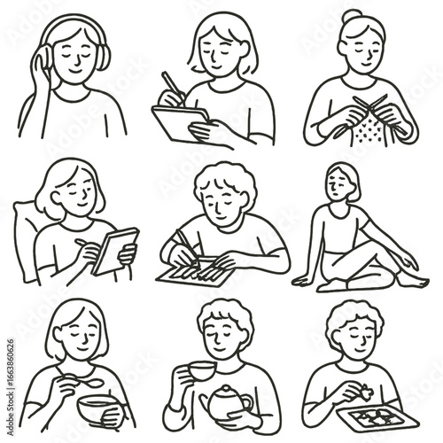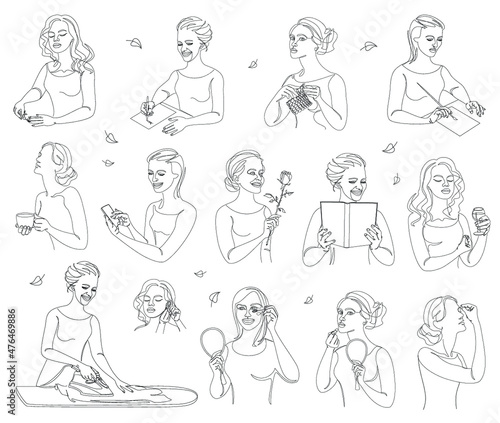 Ženská postava tlačí akupresurní body na krk, loket, hlavu, prsa k úlevě od bolesti a svalového napětí, vektorové ilustrace. Akupresurní masážní terapie, tradiční čínská medicína.
