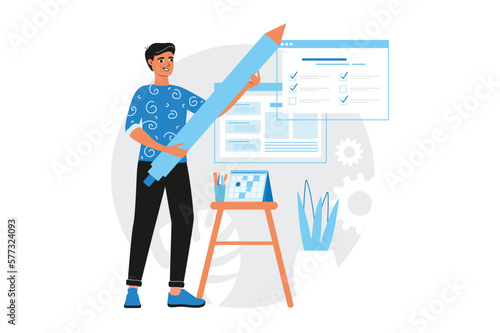 Žena odpovídá na dotazník, odpovídá na otázky průzkumu, plochá vektorová ilustrace. Test, zpětná vazba, kvíz, průzkum výzkumu.