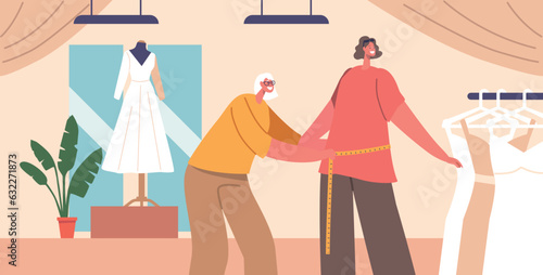 Žena švadlena šití červené šaty. Vektorové ilustrace v plochém stylu. Craft hobby concept.