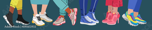Žena nohy na sobě různé módní sezónní boty vektorové ilustrace izolovaných na bílém pozadí. Elegantní, ležérní a sportovní obuv na nohou. Ženské trendy oblečení a styl